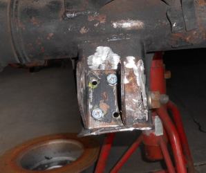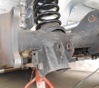 | 下側の取り付けブラケットを約10mmスライドさせます。ココも無加工ボルトオンにしようと思えば出来るのですが、見た目が格好悪くなり製品クォリティーが下がるので、ブラケットの移動だけは行う製品にしました。 溶接は両脇だけですのでベビーサンダーと タガネか壊しても良いマイナスドライバーが有ればそれほど苦労せず取り外せると思います。取り付けはいきなり溶接では無くボルト&ナット止めがお勧め、狭いタイヤハウス内に収まっているコイルオーバーの位置決めはココの1mm、2mmは重要、又、写真のスライドさせた取り付け位置ではリヤキャリパーが当たってしまい後1mm〜2mmの位置変更を要しました、位置決めが決まった後もボルト&ナット4本止めであれば溶接せずとも強度は十分保てます。 |