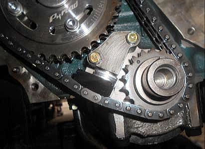 | 高回転時のバルブタイミングの安定性を高めるため チェーンのたわみをアルミワッシャーで調整します。 |