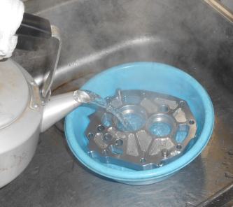 | 沸騰したお湯に浸けている状態です。このように素手では触れないくらい温めてからメインベアリング&カウンターB/gを圧入すればスンナリ入ります。緩い標準センタープレートと同じ感覚でプラスチックハンマーで叩いて入れようとするならまだしも、鉄ハンマーで叩き凸凹にしても入らず、強化センタープレートがオカシイとクレームを付けて来る素人メカが増えてるので記しておきます。 平温ではいくら叩いても入らず、約100度でスンナリ圧入が出来る体験で、平温でユルユルに入ってしまう標準センタープレートじゃあ油温100度以上の状態だと???を再確認出来ます。 |