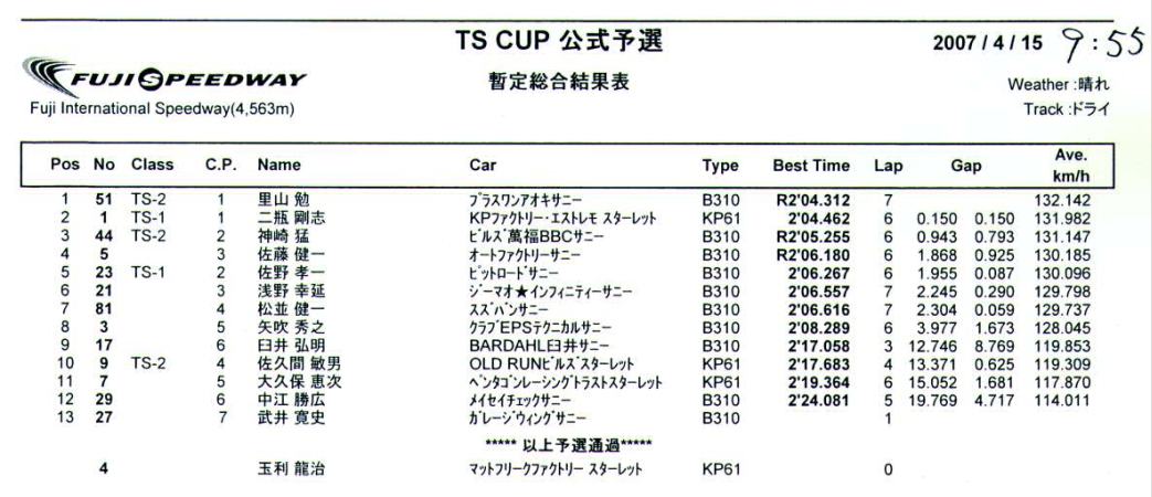 | 約4ケ月ぶりの富士コースインがTSカップ予選。1周が義務周回数なのでピットロード→コースin→コントロールライン通過から次のコントロールライン通過までをニューエンジンの慣らしに使う。気持ちは2周目から全開なのだが、目、手、足が中々レーシングスピードについていかず、マシーンの挙動がようやく感じとれ始めた頃に予選終了。昨年頃から、もうそろ々TSカップスタートの頃と違い年々レベルアップして来ているのでレース前のチェック走行&練習しなくちゃあレースにならなくなって来てるナ〜が予選結果として表れた、レースでは05秒台に突入したいところだ。 マシーンの方は昨年からコツコツと進めてきた軽量化の成果を確認したいので、車検前にガソリン重量を正確に計ってからいざ計測。689kg!アルトより軽いぞ(笑)、TS-1レギュレーション670kgまで後19kgに迫った。でも・・・確か?・・・1983年TS310サニーの車両重量はほとんどのマシーンが670kg前後で、中には650kgを切ってバラスト積んでたマシーンも有り、700kgオーバーのマシーンは重い重いってバカにされてたような記憶が・・・記憶違いかナ〜?。。。ちなみに310クーペはパーツを外すだけ外し、アンダーコーティングも剥がし、FRPパーツ&アクリルに代え『さあどうだ!これで俺のもTSサニー!』にして800kgくらいがほとんどです。 エンジンの方は、ディスビー側のカプラーに繋ぐとほんのちょっと点火時期が低く、クランクピックUP側カプラー側に繋ぐとほんのちょっと高くなる、玄人に見られるとちょっと恥ずかしいオバカさん仕様を設置し予選は低目で走ったので決勝は高目にし違いを確認して見る。ニューエンジンも決勝で他車とストレートスピードを比較して見ないと何とも言えないが、特に不具合は無く好調。 |