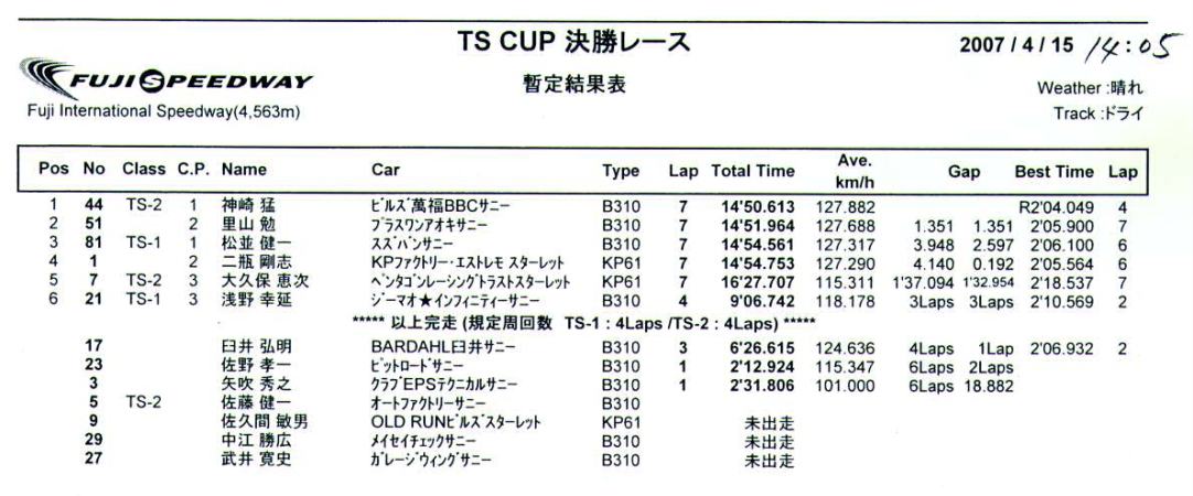 | 接近した予選タイムから誰もがダンゴ状態でのレースバトルを予想するはず。もちろん私もその中の1人で、最終ラップまで何とか生き残り漁夫の利を得ようとスターティンググリッドに着く。 第1コーナーで♯44サニーとサイドbyサイド、寄せたつもりは無いが♯44サニーがスピン!止まって『大丈夫?』と聞く訳にも行かないし実際は置いてきぼりだがちょっと後ろ髪を引かれる思い。予選を不本意なポジションで終わった♯17サニーのプレッシャーが凄い!たまらず最終セクションで先に行ってもらった。じゃあ俺もって感じで♯81サニー君もおねだりして来たが君はダメ(笑)ちょうど真ん中に入れば2台のストレートスピードが分かるので♯81スズバンサニーはブロック。ストレートでスズバンのオヤジさんが睨んでたように見えたのは気のせい?そう言えば(故)RSかなやサンのせがれ真吾も一緒だったナ、オ〜イ真吾!最近TSカップでもオーナーが勝つために活きのイイ若いドライバー乗せるの流行って来てるから今度お前乗れよ、佐野オジさんじゃあもう追いつかん(笑)。 その代わり、たった1周しか走らないレースでもこのようにダラダラと長くレースレポート書かなくちゃあPitroadはダメなんだぞ(笑) 先は長いので♯17サニーのスリップストリームでは各ギヤーともあまり引っ張らずに(回転を上げずに)シフトアップ、ピタリと背後に迫る♯81サニーに抜かれてもかまわない、どの辺で抜かれるのかを確認する方が先決。テールツーノーズのまま3台ともほぼ同間隔でストレートを駆け抜ける。5速9000rpmを超す所で背後の♯81サニーがスリップから抜け出ようとマシーンを横に振った瞬間!!♯23私のエンジンが???えぇ〜?ブロー?ほとんど新品パーツで組み上げたばかりのおニューだから壊れる箇所は無いはずないんだけど?と思いながらマシーンをグリーンに止めエンジンルーム内を点検、オイルは少量、コンロッド君も見当たらない???ハッキリした原因は分からないが5速9000rpmでのエンジンブローが軽症では済まない事は予測できる。 先は長いと思ってたレースだがたった1周で今日は終わり。ガードレール越しのTSカップ観戦側に移行。今日のレースは最終ラップまでダンゴ状態のトップ争いが繰り広げられ見応え十分!サバイバル戦を勝ち抜いた♯44サニーが見事初優勝を決めた。別に偉くはないが♯44サニー君と♯23私の2台だけがTSカップ初戦から欠席無しの皆勤賞参加(主催者サン1回くらい参加費0円にしてくれ(笑))。レース参戦している人なら誰でも想像できるよう、きっと初優勝まで苦難の道だったはず、心からオメデトウを贈ります。 |