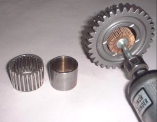 | ギヤとコーンは一体で1ツの部品なので通常コーンを脱着する事は無い。納品したお客さんからベアリングだけならスムーズに入るのだがカラーと一緒だと入らないとクレームが有った。てっきり仕上げ精度のバラツキだと思いその場は代替商品を発送したが、その後2.1スパーローのみならず、サーボ→ワーナーシンクロの作業が増えコーン脱着が増えると・・・小さい56Aギヤはささいな力の圧入で歪む事が判明、歪むと言っても1000分単位なのでフラップホイール等で軽くサラうだけでベアリング&カラー一体でもスムーズに入るようになります。 | ||