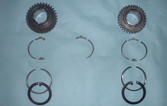 | 当社ではレーシングスピードからのシフトダウンが入り易いようにと、1速シンクロを2速〜5速シンクロに替えています。今回販売の2.1スーパーローは2速〜5速コーンが標準装着ですので、写真中央のスラストブロック1ケとブレーキバンド1ケが別途必要となります(両方とも新品は生産廃止)。 シンクロ機構を替えないと凄く入りずらいのか?と言うとそうでもありません、さほど変わらず入ります。ミッションに限らずチューニングアップはどれもほとんど変わらないのだが理に叶った方、良くなるであろうの方に行うのと同じと考えて頂いて結構です。 スラストブロック1ケ、ブレーキバンド1ケお持ちで無いお客様には標準1速用コーンを装着し納品しますのでリクエスト下さい。 |