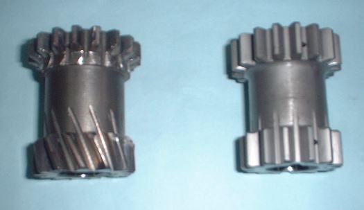 | 中々激しく削り取られたバックギヤ!これだけ無くなるともうバックには入らないでしょうネ?(笑) 材質や強度の問題では無く、ド〜してもレーシングしながらのバックギヤ入れが原因かと思われます。 フォーミラカーじゃあ有りませんから現実は中々難しいかと思いますが、バックギヤを使うのはコース上でスピンした時だけ!パドックではバックに入れない!を心がけて下さい(笑)。 |