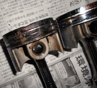 | エンジン降ろしてからヘッド取外しがセオリーだが、依頼者が早く状況知りたがってるので先にヘッド取外し。1番ピストンがノッキングによる棚落ちでご臨終。死刑宣告は早い方がイイからネ 一昔、二昔前なら コ〜なる前にヘッドガスケットが抜けてくれ、ヘッドガスケット交換だけで済んでたのだが、今はメタルヘッドガスケットが耐えてくれちゃうので お金が掛かるピストンブローに成っちゃいます |