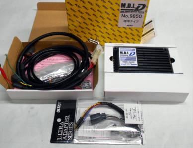 | M.D.I.取り付け お客さんから特にリクエストが無い場合 ピットロードでは円筒コイル用ハーネスキットを取り付けます。カプラーを差し替えるだけで 標準フルトラ点火とMDI点火に換えられる優れ物。キャブ車はグス付いたり 調子イマイチになるのは日常茶飯事、つい々疑いたくなるのが点火系、コレさえ付けとけば 不調の原因がMDIで有るのか?無いか?がカプラー差し替えだけですぐに分かりますからネ エンジンルーム内は所狭しとばかりパーツが付いてるので本体は車内に取り付け。バッテリーもエンジンルーム内に無いので ちょっと面倒。 |