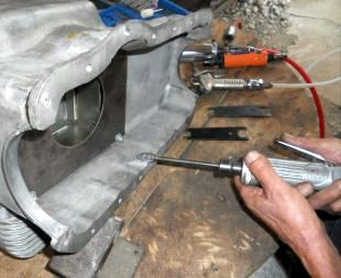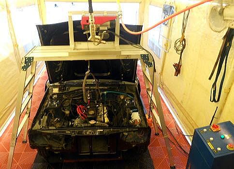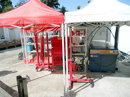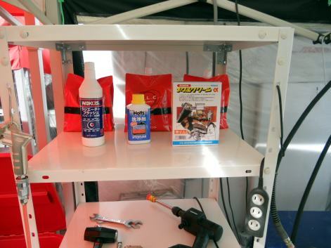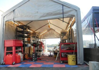 | レストア専用テント内には、サンダー、ドリル、リューター、サンドブラスト、溶接機、その他 を設置、作業台の上に作業途中のまま放置できるのが作業性抜群♪ テントなのに電気工事屋サンがコンセットを設置してくれたのも 便利に使ってます | ||