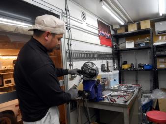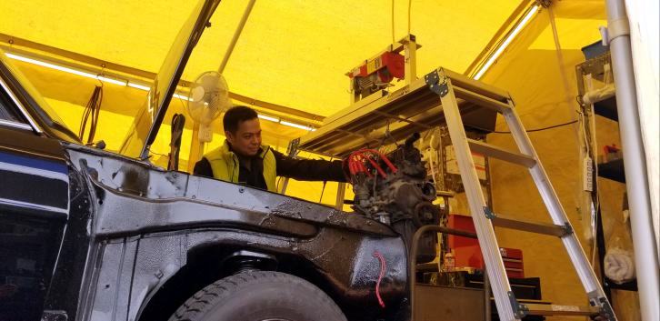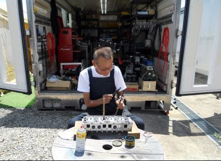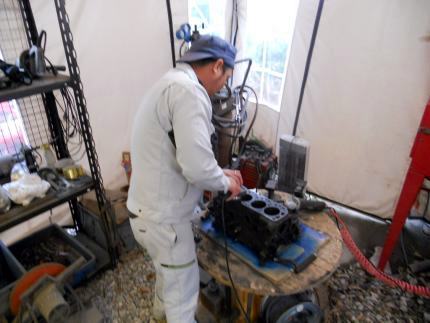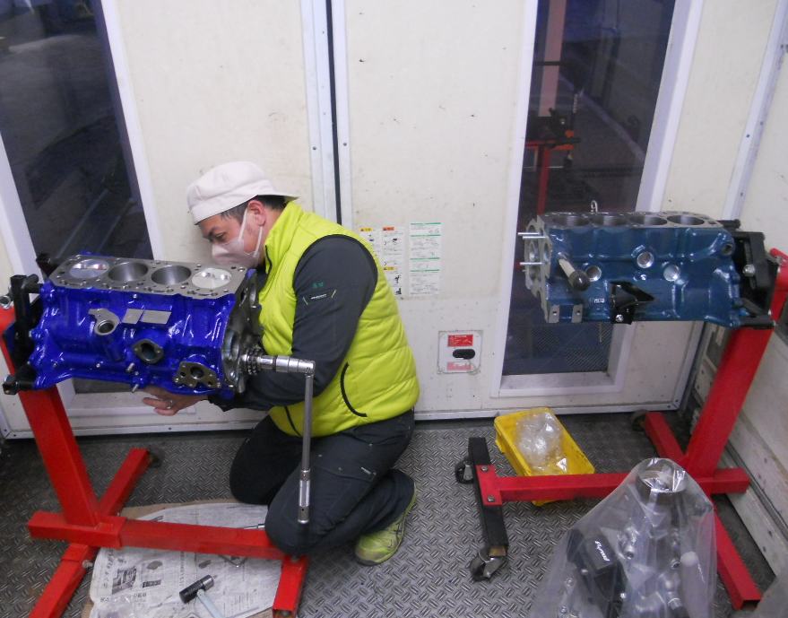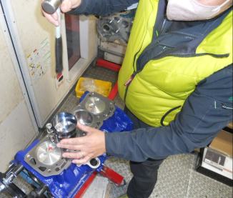 | テント内作業場で 分解・洗浄を行い → 屋外作業場で削正加工・E/gブロック塗装を行い → 空調設備完備のコンテナ作業場で 組み立てを行います | ||