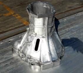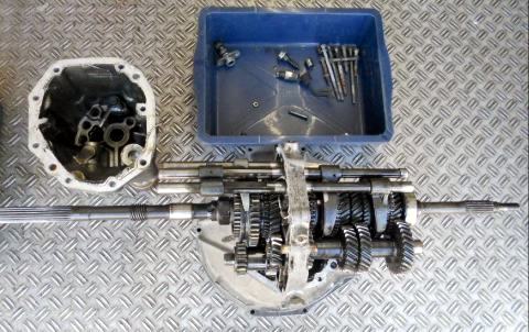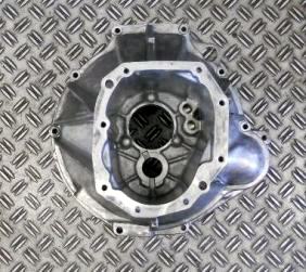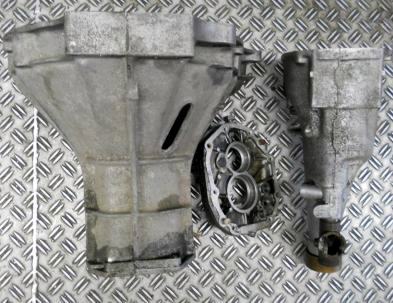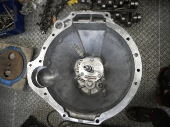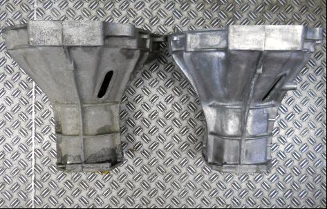 | 左が依頼者が持ち込んだ直結5速に付いてたフロントケースとリヤケース。右が新たに仕入れたフロントケース、平成サニトラ最終後期型4速に装着された最も新しい、新たな“型”から鋳造された剛性の高いフロントケース。 装着されてた直5のフロントケース再使用・レストアでイイんですが、依頼者が“フル!”で新規製作してくれとの強い要望だったので、TSサニートップチームと同じ仕様のフロントケースでレストア・組み上げます |