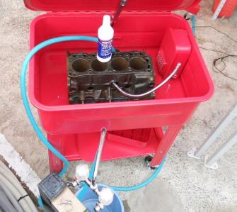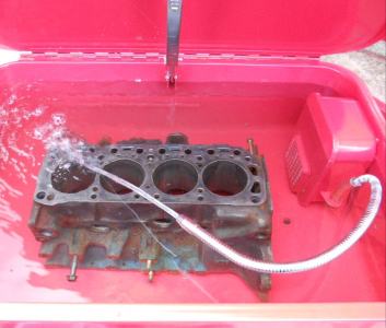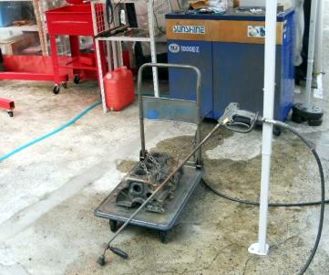 | 今回からの試み 漬け置き 素手では触れないほどの熱湯にWAKOのラジエター洗浄剤を入れ一晩漬けます。ただ漬けとくより 循環させた方がより効果的だろうと 循環機能付き洗浄台をチョイス!この後 もう1度 高圧温水洗浄機に掛けます |