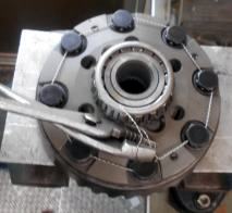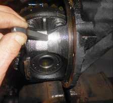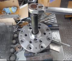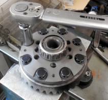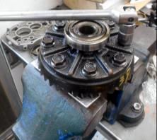 | リングギヤ取り外し、サイドB/g取り外し H165デフはサイドB/g圧入の奥に 0.05〜0.50 4種類のシムが片側2〜3枚くらいずつ入っているのでマイクロゲージで測定しバックラッシュ調整します。初心者メカだと1回では中々決まらず、サイドB/g脱着を2〜4回繰り返す事になり、コレがH型デフの面倒なところで多くのメカに嫌われてます |