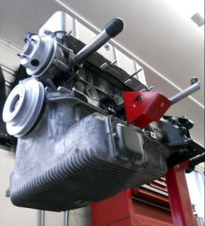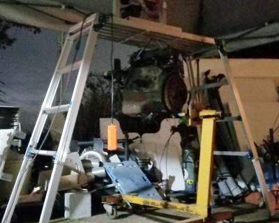 | エンジン取外し このアルミ脚立+電動ウィンチは、サーキットでのエンジン交換用に製作。A型エンジンはフライホイール+クラッチ付きでも たかが80kgオーバーなので、2人居れば人力での脱着可能だが、作業をスマートに、楽に出来るよう製作。脚立は折りたためますし、ウィンチも小型ですのでコンパクトにサービスカーに収納可能。 バックでテント内に入庫させた時はエンジンクレーン使用になるかな? |