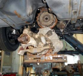 その確認でもあります。 ミッション取り外し 安価なミッションジャッキの昇降がイマイチ、シザーリフトを下げないと届かない、とりあえず取り外しに問題は無いが、取り付け時までに もう少し高い位置でミッションとエンジンをドッキング出来るよう対策しましょう |