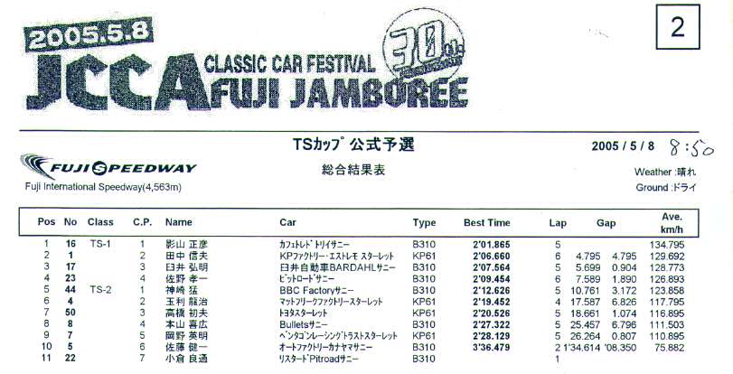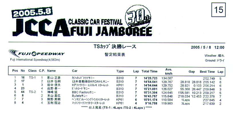 | 4/15富士初走行2分11秒、前日(5/7)練習走行2分10秒なので、予選はもちろん2分一桁台突入が目標。予選時間はたったの15分しか無く5〜6周しか周回出来ないが、大混雑のフリー走行と違いクリアラップがとれるのでタイムアタックはし易い。2分9秒454をマークしとりあえず当面の目標は達成したが、マシーンセットアップの遅れから前の3台に大きく差を付けられ4番手。 2分1秒台を叩き出したO景山選手は別格としても、予選2番手@KP61、3番手P310サニーから2〜3秒遅れが結果として残ったので、2〜3秒短縮がこれからの課題。 キャブのセッティングにほとんどの時間を費やしてしまい、♯23サニー2005年仕様で紹介して来た足回り、他のパーツに全く手が付けられなかったのがちょっと残念だが、富士でのTSカップは今回がスタート!パーツやセッティングでタイムUPして行く様子をHPで公開して行ければと思う。 |
