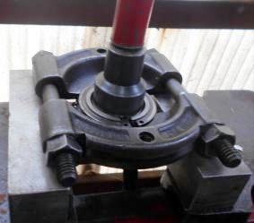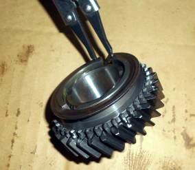 | 入りの悪い1速シンクロを | コーンを外すため温めて | プーラー用にクリップ付け | ギヤとコーンを分離 | 2速〜4速と同じシンクロへ |