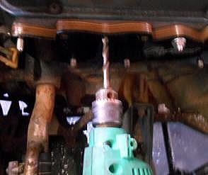 シリンダーヘッド単品の状態でスタットボルト穴を新設するのですが、今回のように車載状態で、上下、左右、狂い無く真っすぐに取り付けるには