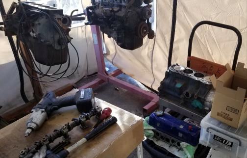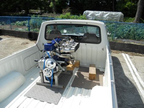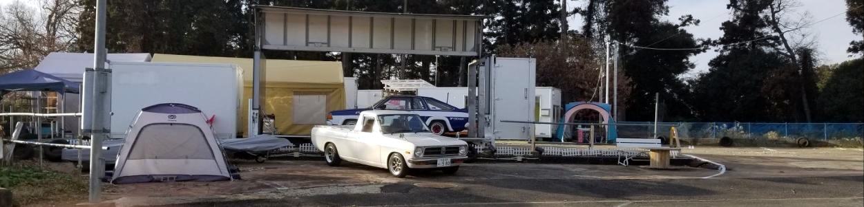 A14ベースエンジン持ち込みご苦労様でした。コ〜ユ〜時は荷台の有るサニトラは便利だネ♪ 隣りに設置してあるテント、ココで誰か寝泊りしてるんですか?ってよく聞かれるんだけど、寝泊りしてる訳無いジャン!後ろに駐車してあるトレーラーのボディーカバー格納庫です。ガレージテント設置し トレーラー出し入れの方が楽なんですが、せっかくのウィングコンテナ内のディスプレィ#23号車がテントで隠れちゃうのでボディーカバー保管なんです |