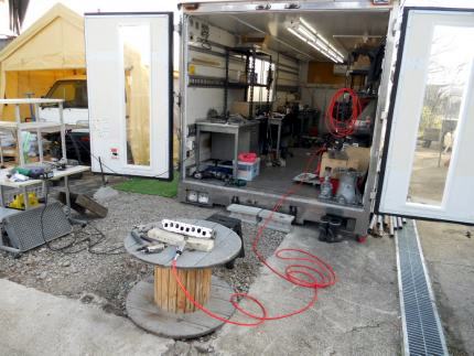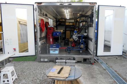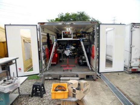 ご苦労様 と 労いの言葉を掛けられぬよう制作したSST、成ってますでしょうか? 富士スピードウェイ&筑波サーキットガレージで たまに使う事は有りましたが、まさか?コンテナハウスにサイズドンピシャ!流用出来るとは、、、 この後 パワーゲート付きサービスカーキャラバンをバックで着け 積み込み 移動 着地 まで全て1人で出来るようにしてあります |