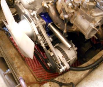 | GXヘッドは運転席側にオルタネーターが付けられません ファンベルト調整バーを削正・溶接も考えましたが、ストリート走行中の破損・走行不能も有り得ますので、まつおか製オルタネーター移動キット 12.700円で助手席側に移動 |
