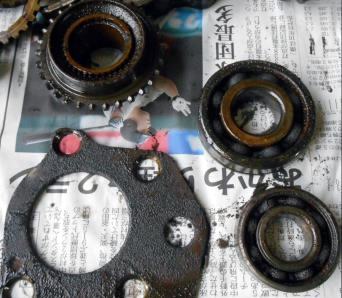 | 全バラにしました 特にリヤケース側の錆びが酷いネ。ド〜せベアリングは全て新品に替える予定だった、とかの問題じゃあ無い(笑) でもギリギリ タッチセーフって感じ、錆びが原因で決定的に使えない部品は無いから、ちゃんと直るヨ |