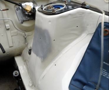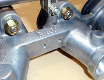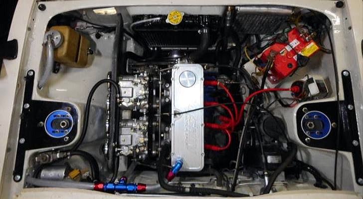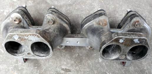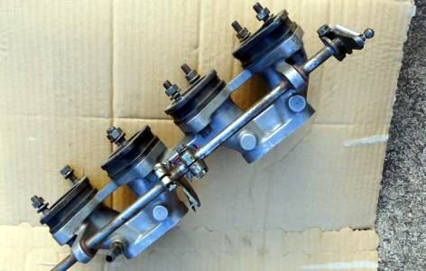 インナーフェンダーを鬼のようにブッ叩き凹まし、インマニ+キャブ+ファンネル付きのまま脱着可能にしてあります。 WEBERタイプOER47Φは仮付け、付いてたSOLEX44Φに戻しますのでご安心下さい。ちょっと残念なのはSOLEXだとターンバックル取り付け位置がファンネルに向かって.左、左 になります、WEBER or OERは 左、右 。 これくらいは妥協できます。 |