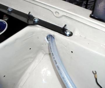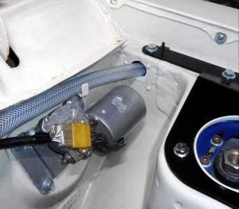 | OILキャッチタンクまで導くブローバイホースをインナーフェンダー内を通すのがピットロードレイアウト。コ〜しなくてはいけないと言う掟は有りませんが、やらなくてイイ?面倒な作業のため
