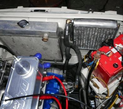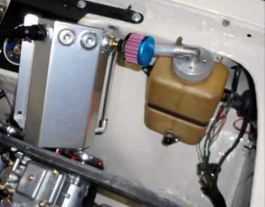 | Opt'オイルキャッチタンク取り付け。アルミOILキャッチタンク2Lは縦が長すぎてB110のエンジンルームには収まりませんでした、1L用ならサニトラに付けた事が有りますので装着可能、今回はOpt'オイルキャッチタンク、Opt'オイルクーラー