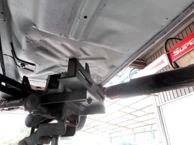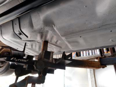 大した金額じゃあ無い。何だヨ この仕上がりなら自分でやった方がマシだったヨ、と言わないように、依頼した方が悪い(笑) この画像見て フロアーが真っ平らなのが分かるでしょう?私もジーっと観察した事はあまり有りませんが、、、。60Φのパイプを現車合わせでフロアースレスレでマフラー制作しても、OILパンより下、フレームより下に位置し マフラーが一番地面に近くなります。 フロアーぶっ叩き加工でサイドマフラーに出来たのは、今とは比べ物にならないくらい車高が高かった当時のTS110サニーの時代、21世紀仕様はフルブレーキングでフロントスポイラーが路面を擦りますので、フロアー削正の大手術が必要になります |
