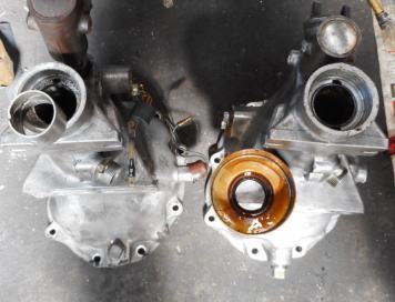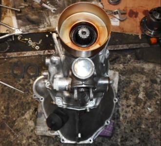 | プロペラシャフトの傷の元は このリヤEXテンションブッシングです。ココがイマイチなのはオーバーホール時から分かってましたが許容範囲内の判断で納品してます。このミッションは1度プロペラシャフトがネジ切れる?に近いトラブルを経験してます。メインシャフトの一番後ろのスプラインが曲がっておりプロペラシャフトが刺さらずベビーサンダーで削って入るようにしてあります。トラブルの時にこのブッシングが破損したただけで無くミッションケースまで傷だらけに成ったため、ミッションケース側の穴を拡大しサイズ違いのブッシングが入れてありました。写真左が標準、右か付いてたオーバーサイズ。コンマ単位のクリアランスがベストですが1mmほどありますのでガタが有り
