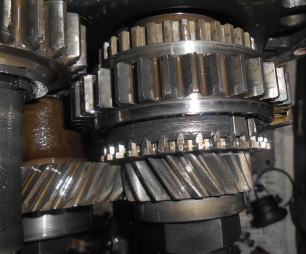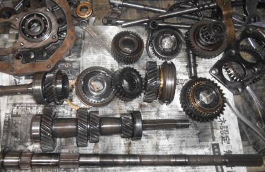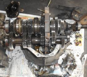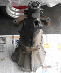 | 降ろしたミッションを分解 ミッション型式はFS5W71B。オーバードライブ5速にサーボシンクロが使われているのが前期型で、ワーナーシンクロが使われているのが後期型となります。このミッションには写真右のように5速にサーボシンクロが使われていますので前期型となります。 ギヤの歯数を1枚々数えギヤ比を計算し分かり易いよう表に現して置きますので ご参照下さい。 |