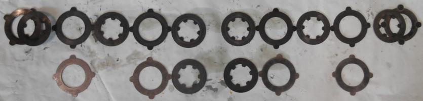 | ↓ (写真上)付いていた標準溝なしLSDプレート6枚X2の中から、(写真下)溝有りプレート&t=1.9プレート3枚X2に入れ替えます。t=1.9プレートは亀有カタログにも載っている通常イニシャルUPに使うプレートだが今回は磨耗したプレートを新品状態に戻すために使用。溝有りプレートはLSDチャタリング音軽減に投入。日産LSDのチャタリング音は大きいだけなら我慢できるのですが音が汚いんですヨ、納車時に『けっこう凄い音するけど最初だけで当たりが出たら少しずつ静かになるからネ』と渡しても皆心配になって『大丈夫でしょうか?』とチャタリング音の点検に訪れるので溝有りプレートで対処。 ワイルド仕様では無くストリート快適仕様にチューンUPしました、新品の効き味に戻ったLSDフィーリングを体感しながらお楽しみ下さい。 |