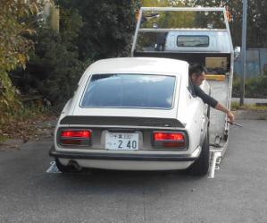 | エンジンは掛かり動きますが車検切れのためお客様から引き取り要請。 セーフィティーローダーは所有していないのでピットロードから車で15分くらいの所に有る old car shop WARPサンに回送を依頼。普通の車検屋サンだと旧車と言うだけで敬遠されますが旧車メインショップなので手慣れたもの、安心して任せられます。 | ||