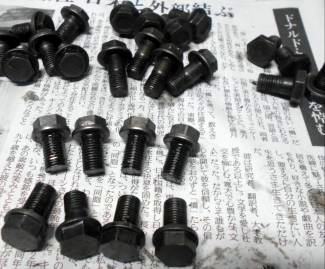 | リングギヤボルト外したら 頭もネジ部分も削って有る流用ボルト付き。危険?ってほどじゃあ無いが短か過ぎて見た目も悪い。H150リングギヤボルトはとっくの昔に生産廃止、日産部品に発注しても新品は出ない。ピットロードのゴミの山の中・・・じゃあ無く お宝の山の中にH150ボルトは埋もれていたが、H150ボルトってM10 P-1.25は同じだが 頭14mm or 17mm 他、部品番号は同じなのに数種類存在するふざけた設定。中古ボルト同型が8ケ揃わない。使用に問題は無いが見た目が悪い。依頼人はクルマ屋のプロ、コイツ絶テー イニシャルトルクいじくり回して見ようかな?と触るよな?メカニックってのは自分のは横着するくせに 人がやったのは『アッ!違う形のボルト使ってる!』とケナス嫌な性格の持ち主、同業だからよく解る(笑) ド〜すっか? | ||